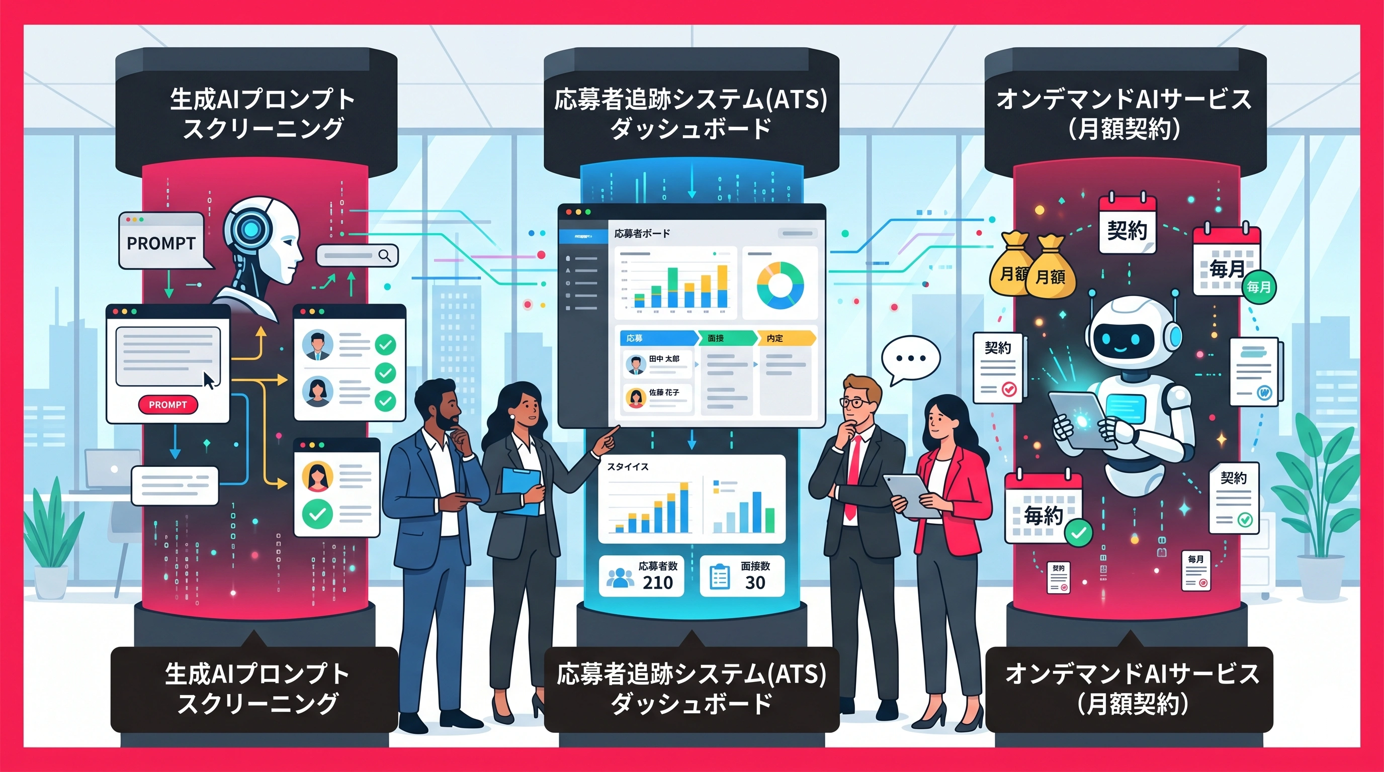 しかし、生成AIや採用管理システムの進化によって、状況は大きく変わりました。月額数千円から導入できる採用支援ツール、汎用的な生成AIを使った独自スクリーニング、AI機能を標準搭載したATS(Applicant Tracking System)——選択肢は格段に広がっています。