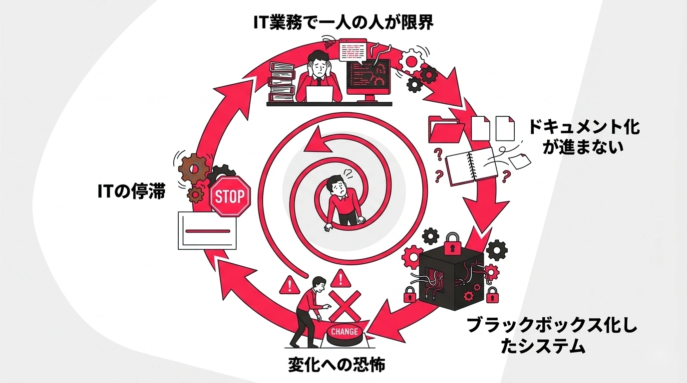 属人化は、ブラックボックス化・退職リスク・変化への恐怖という負のサイクルを生み、組織のIT活用能力そのものを蝕んでいきます。