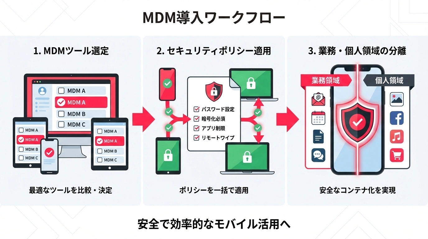 社用携帯・BYODのどちらを選んでも、MDM(Mobile Device Management)ツールの導入は必須です。MDMは端末の設定管理・セキュリティポリシー適用・リモートワイプなどを一元的に行うための管理ツールです。