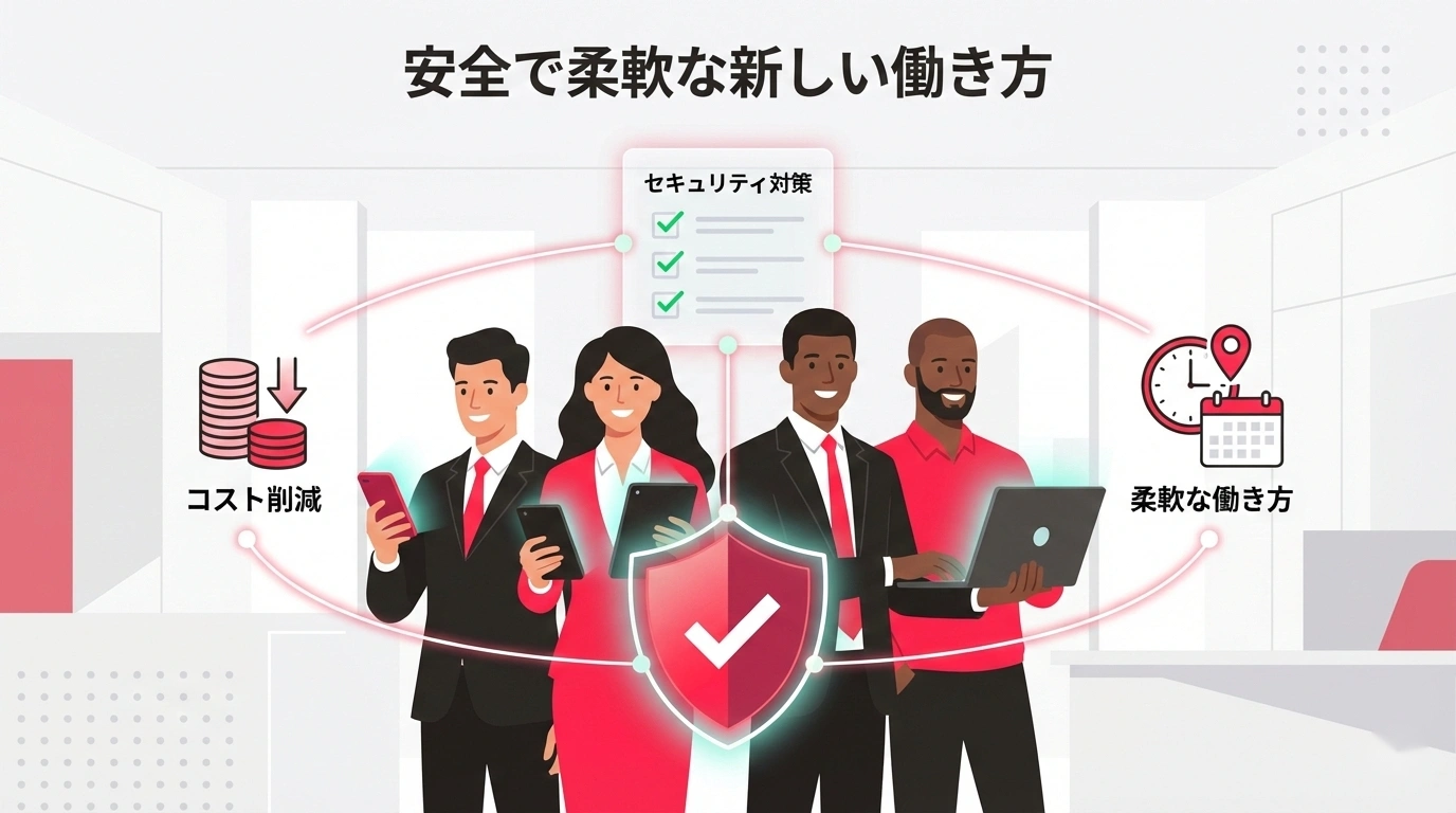 ただし、BYODには隠れコストもあります。セキュリティポリシーの策定、社員への教育、トラブル時の対応(「私物端末の故障は会社の責任か」といった線引き)など、金額に表れにくい運用コストを見落とさないようにしましょう。