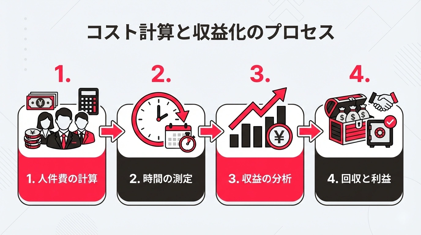 シンプルですが、「時間あたり損失額」の算出がポイントになります。これを正確に把握することで、リアルな損失額が見えてきます。
