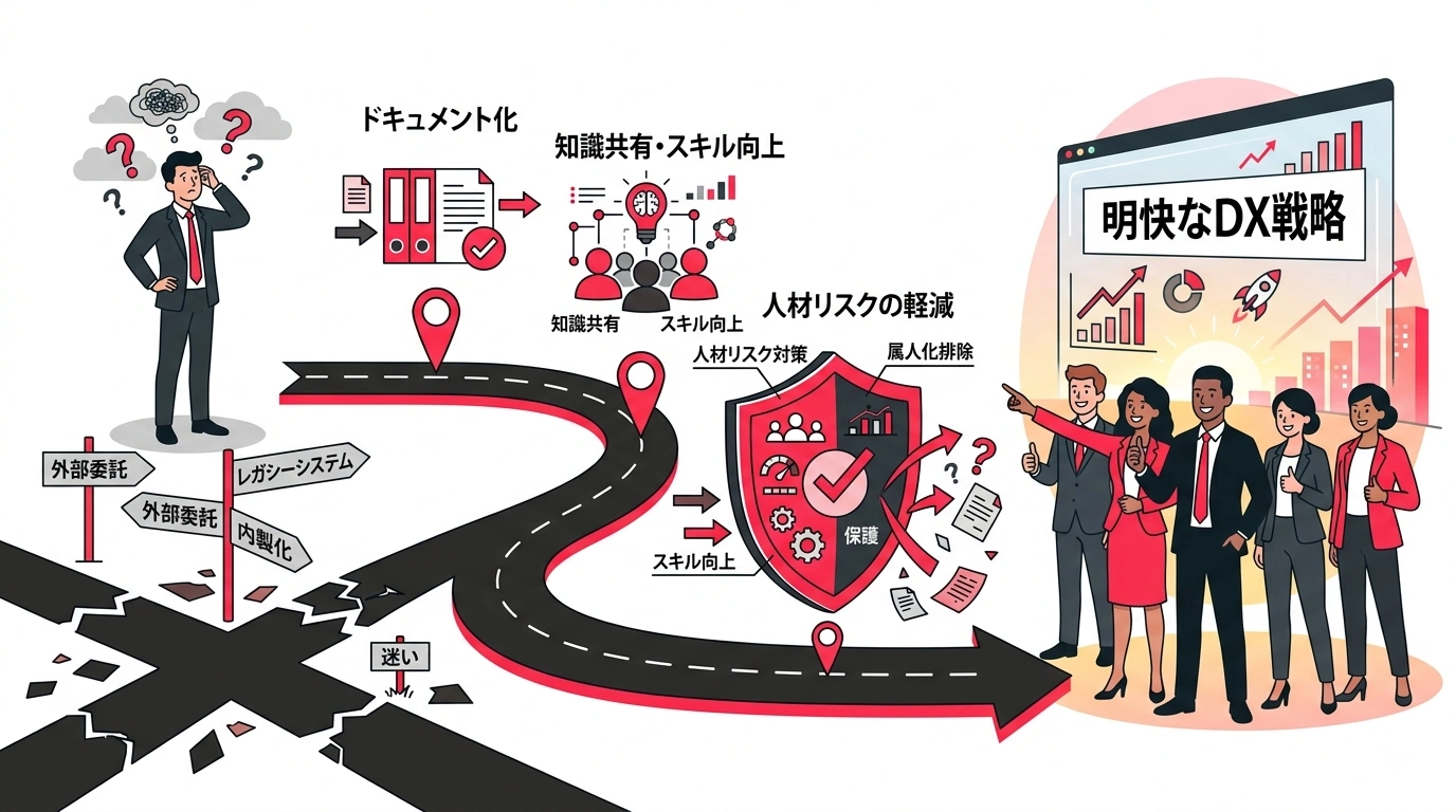 そして最も怖いのが退職リスク。たった一人のIT担当者が辞めてしまったら、進行中のDXプロジェクトは止まり、導入済みのシステムの管理者もいなくなります。外注先との窓口も、内製で作った仕組みのノウハウも、すべて一人の頭の中にある——この状態は経営リスクそのものです。