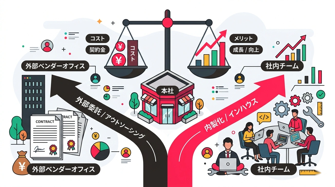外注か内製かの議論は、多くの場合「どちらがお得か」というコスト比較に終始しがちです。しかし中小企業の現場で本当に考えるべきなのは、**「どちらがリスクが低いか」**という視点です。