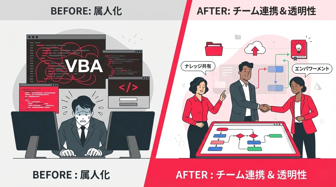 ノーコードツールへの移行は、単に「VBAを別のものに置き換える」だけではありません。移行することで、以下の構造的な問題がまとめて解消されます。
