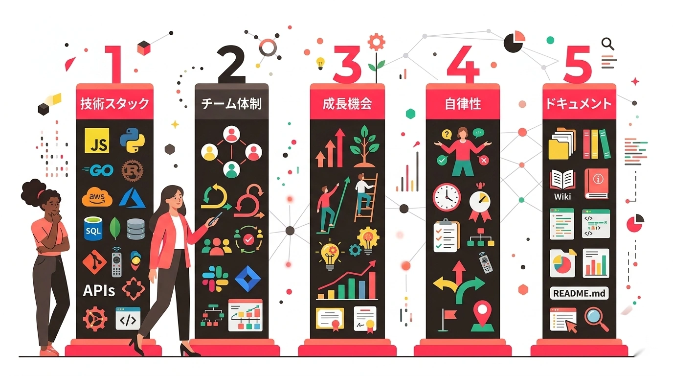 「フルリモート可」は、もはやエンジニア採用における差別化にはなりません。エンジニアが本当に見ているのは、技術スタックの透明性・チーム体制・成長機会・裁量権・ドキュメント文化の5つです。