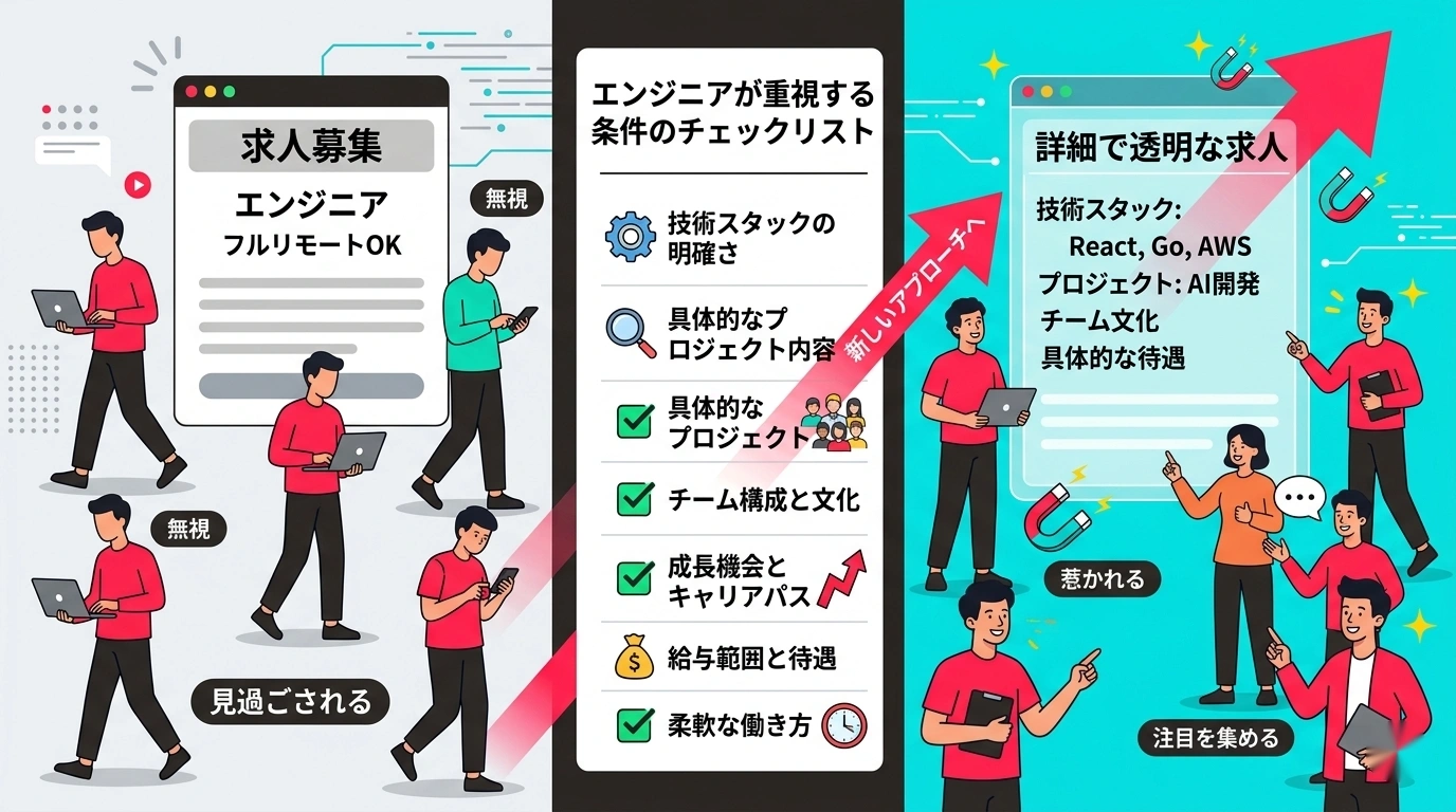 「フルリモート可」と書くだけで人が集まった時代は、すでに終わっています。では、エンジニアは実際に何を求めているのでしょうか?
