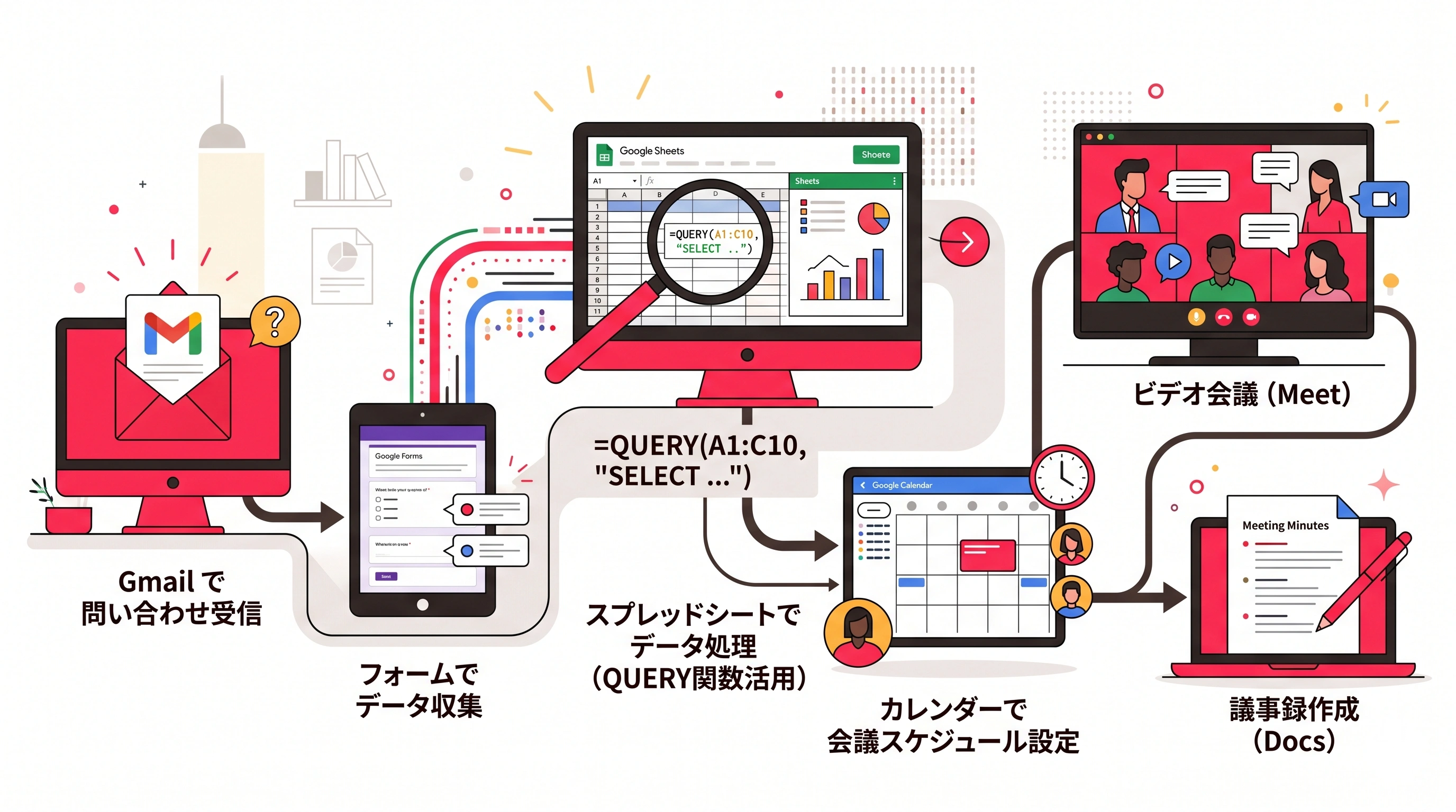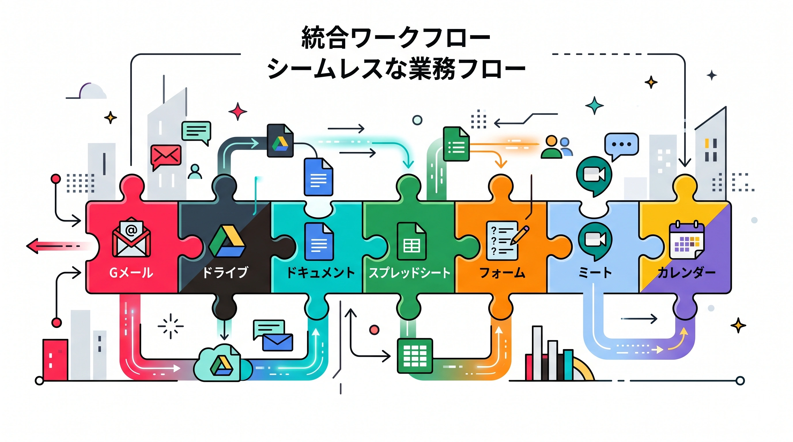Google Workspaceの真価は、単なる「メールとファイル共有」ではありません。複数の機能を組み合わせることで、アナログ業務をデジタル化し、社内の情報共有を劇的に速くするところにあります。