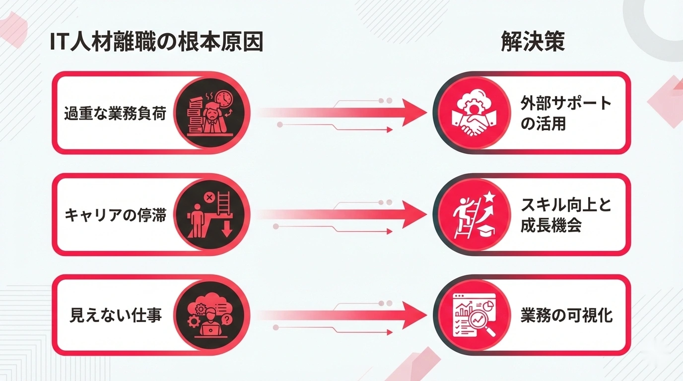 つまり、ひとり情シスの離職防止に本当に効くのは昇給ではなく、「辞めたくなる構造」そのものを変えることです。