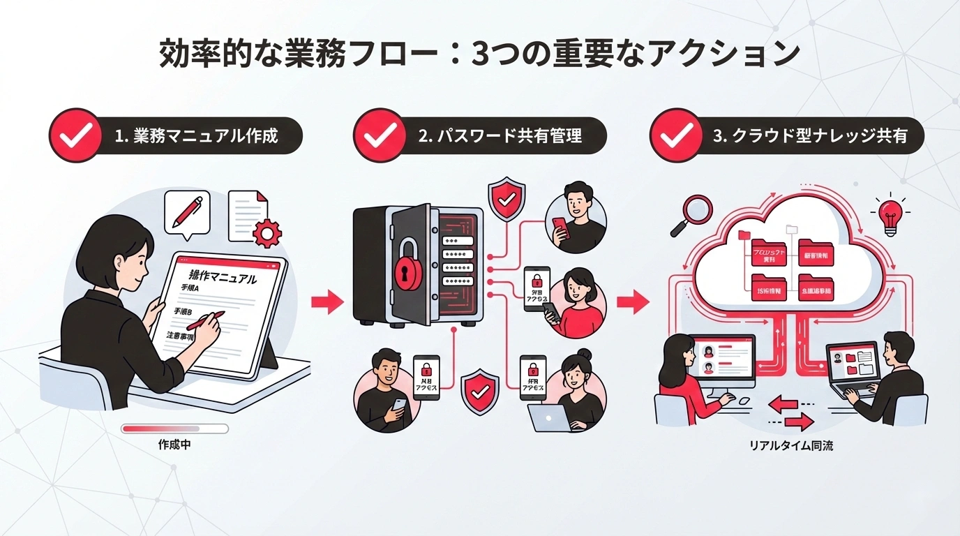 | 2ヶ月目 | マニュアル作成・パスワード管理 | 業務マニュアル+認証情報の一元管理 |