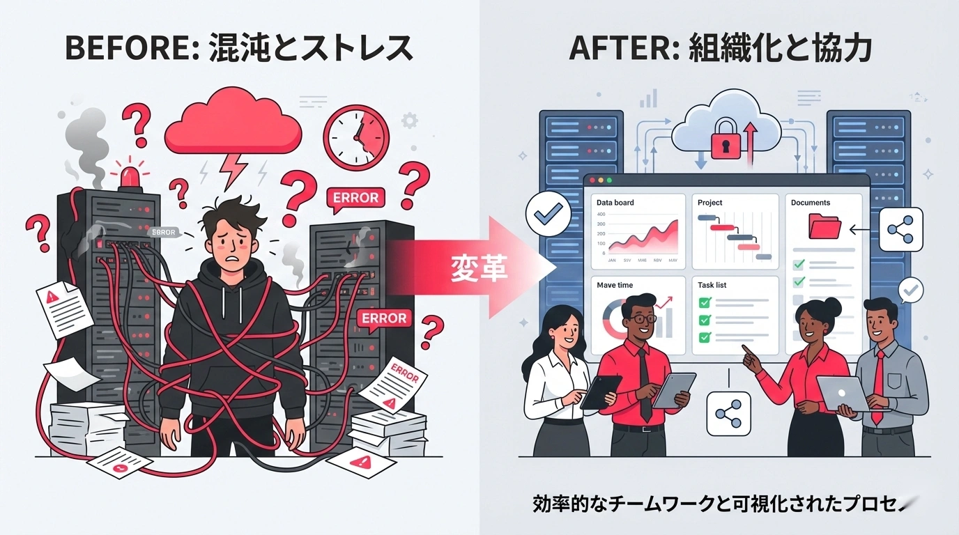 「属人化の解消」と聞くと大掛かりなプロジェクトを想像するかもしれません。しかし、中小企業に必要なのは大規模なシステム刷新ではなく、日々の運用を「見える化」して「共有可能にする」ことです。