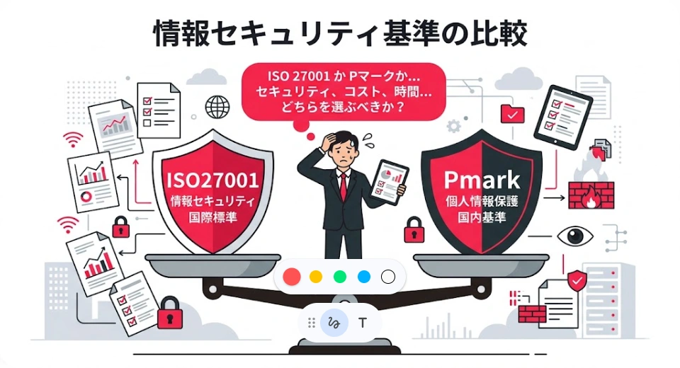 経営層からは「じゃあ取ればいいんじゃないか」と軽く言われるものの、調べてみるとISO27001とPマークはそれぞれ仕組みも費用も違い、しかも両方取っている会社もあれば片方だけの会社もある。どちらを選ぶのが正解なのか、判断材料がないまま時間だけが過ぎていく。そんな状況ではありませんか。