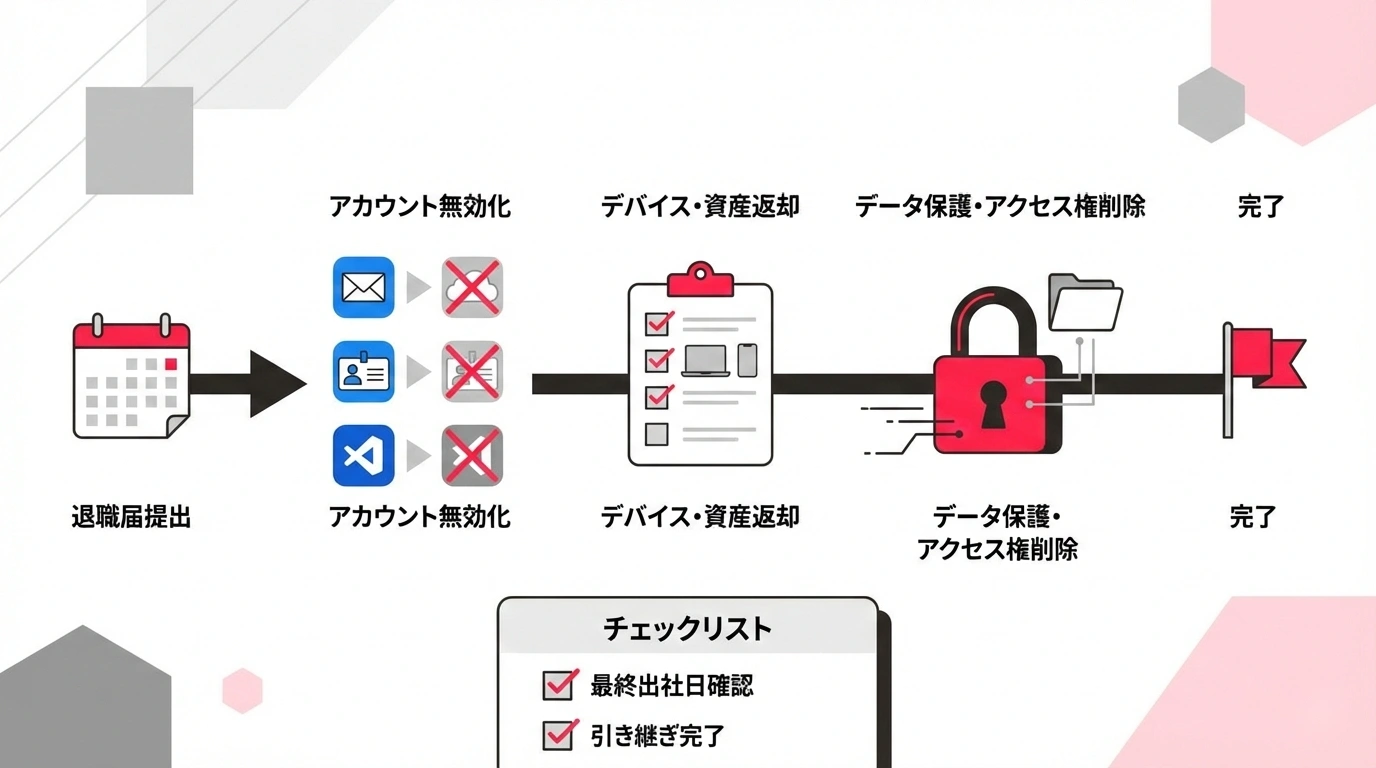 - 退職時のID管理は、「棚卸し → 引き継ぎ → 無効化 → フォローアップ」の4ステップで進める