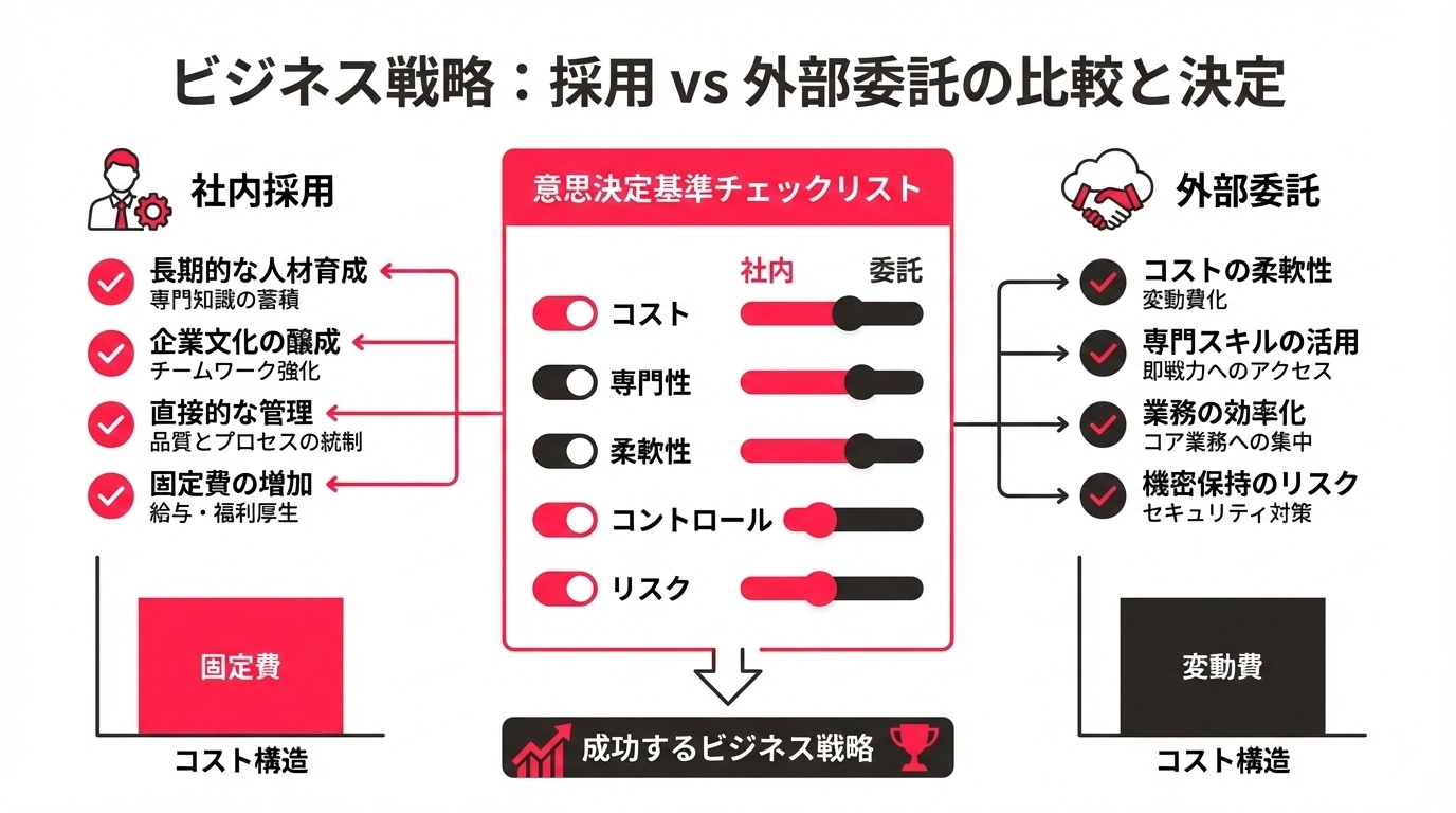 採用とアウトソーシングの比較において、稟議を通すために重要なポイントを改めて整理します。