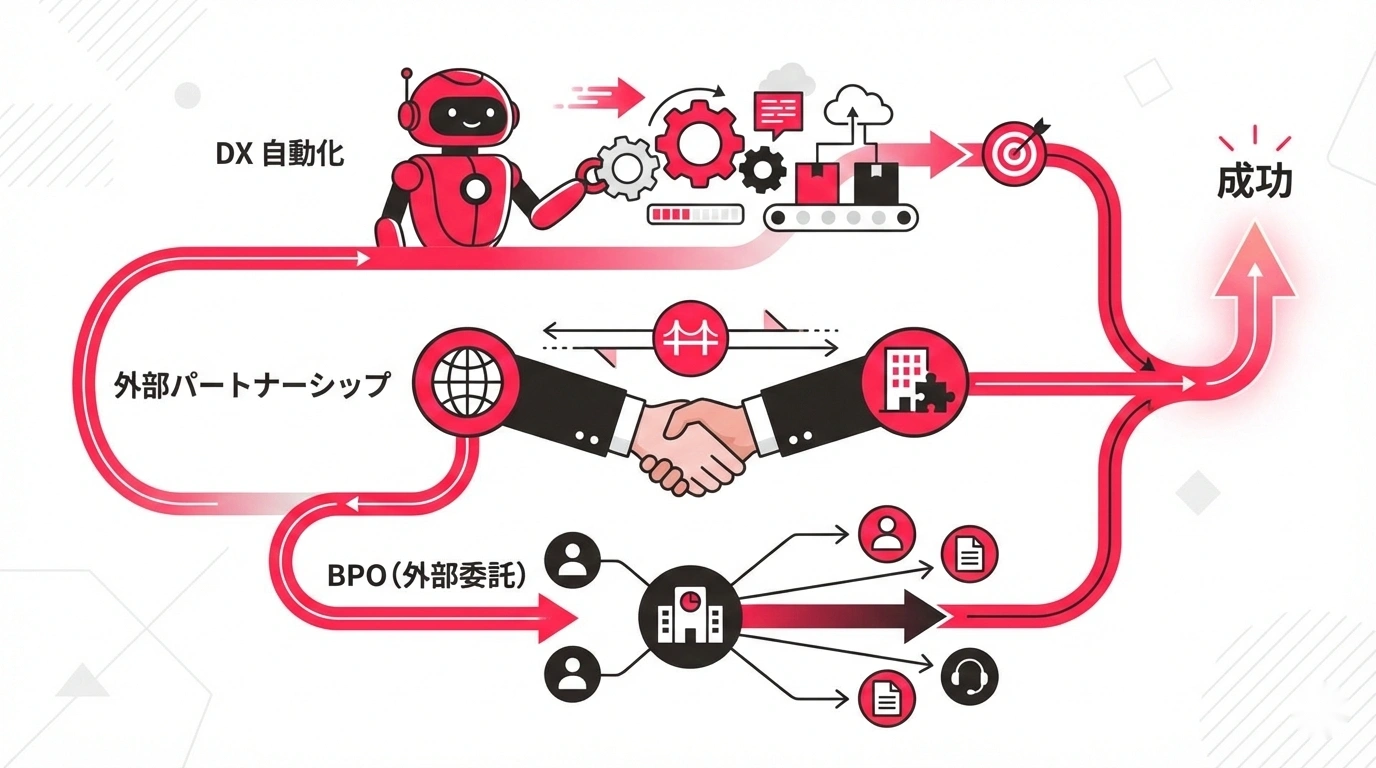 - 外部パートナーへの業務委託:専門スキルを持つ外部チームに任せる