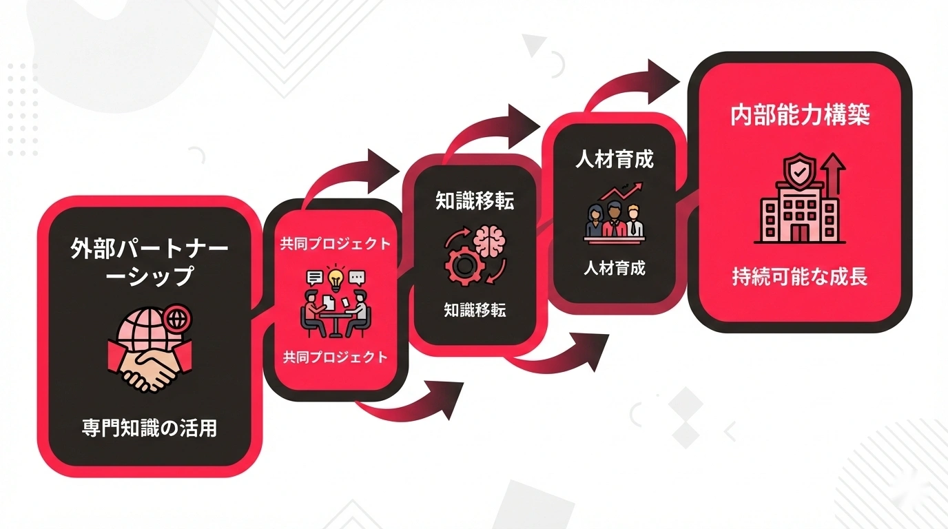 その場合は、外部パートナーと協働しながら、段階的に内製力を強化するというアプローチが有効です。