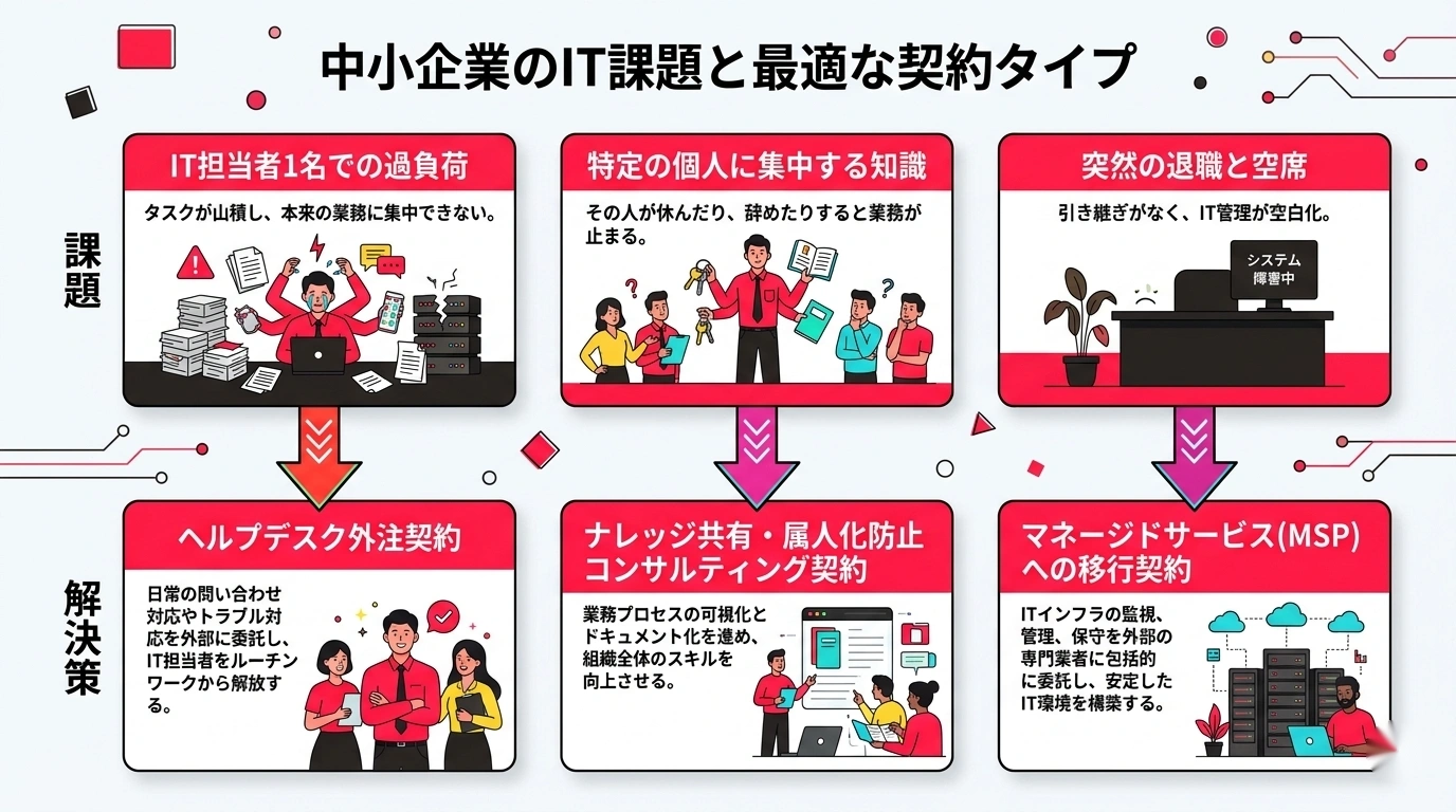 「違いはわかったけど、うちはどれを選べばいいの?」という声にお答えします。中小企業が直面しがちな3つの課題別に、最適な契約形態を解説します。