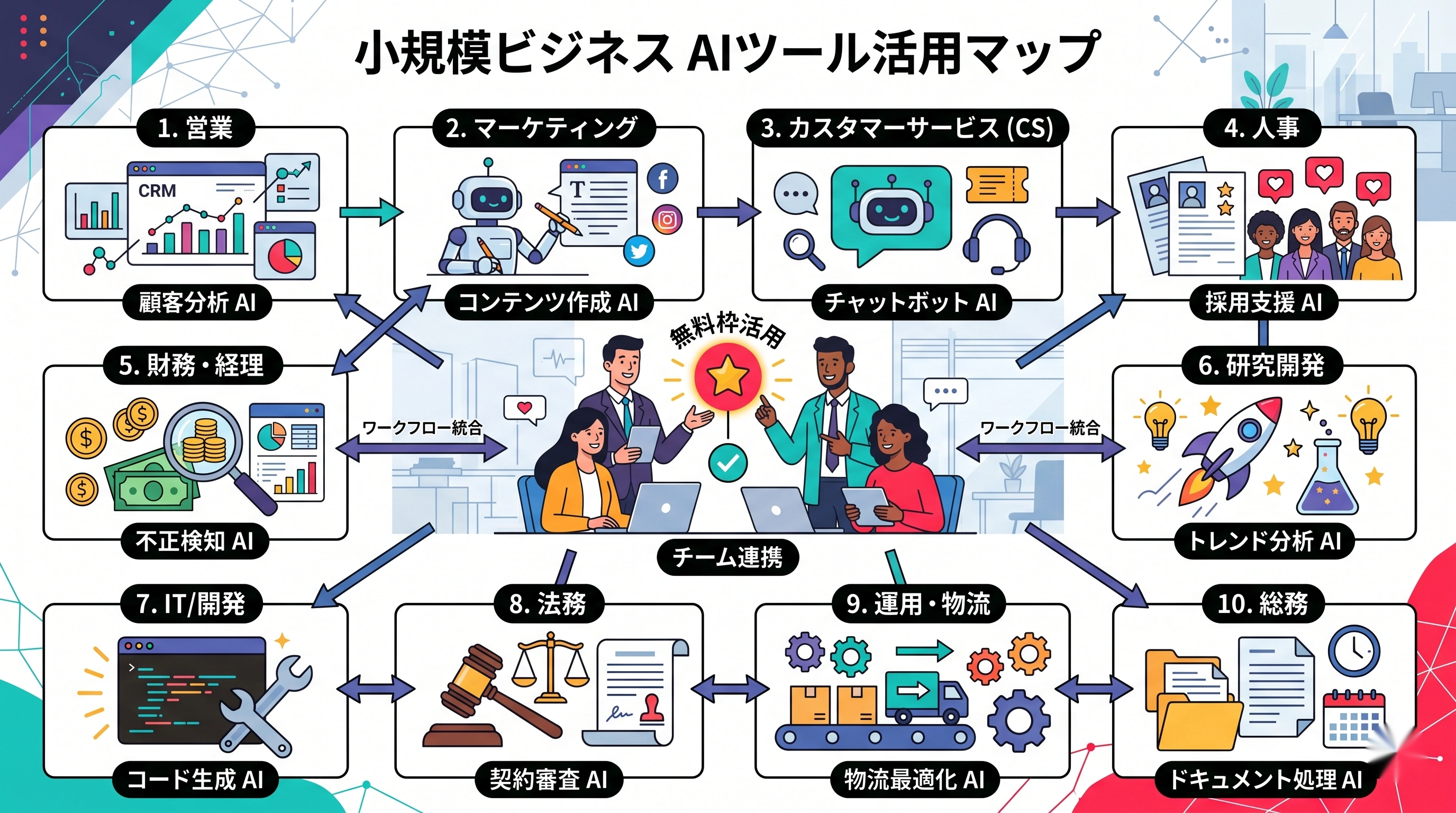 「生成AIが話題だが、自社のどんな業務に使えるのか分からない」「ベンダーから高額なAI導入パッケージを提案されたが、費用対効果が不透明」「そもそも無料で試せるAIツールがあるのかすら、情報が整理されていない」——中小企業の現場で、こうした声をよく聞きます。