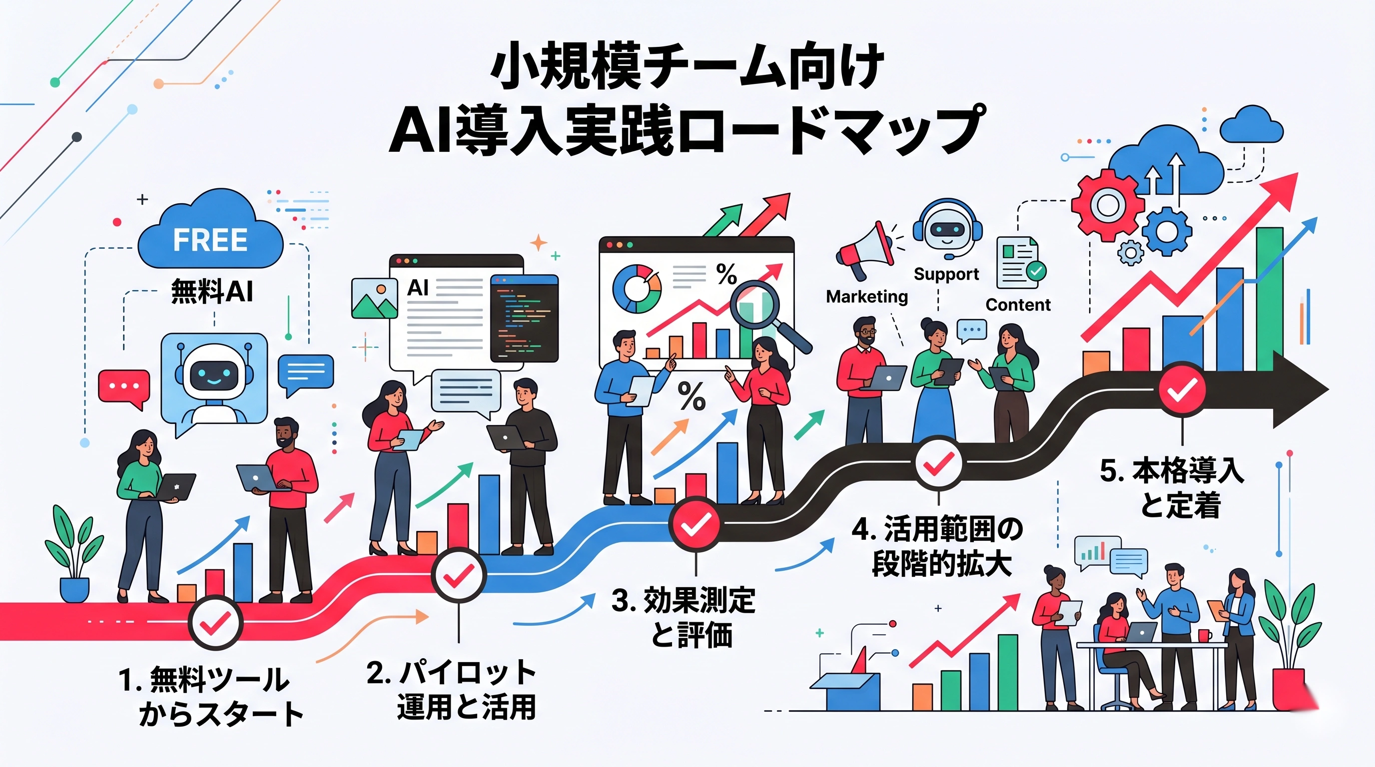 重要なのは、AI導入を「システム導入」ではなく「業務改善」として捉えること。大がかりなツール選定・カスタマイズ・社内研修に時間をかけるのではなく、明日からでも試せる無料ツールで小さく成功事例を積み重ねていくアプローチが、中小企業にはフィットします。
