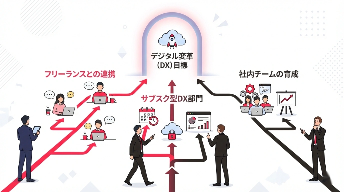 特に最後のポイントは重要です。「エンジニアを採用する」という固定観念を捨て、「DXを推進する」という本来の目的に立ち返れば、正社員採用以外の選択肢が見えてきます。