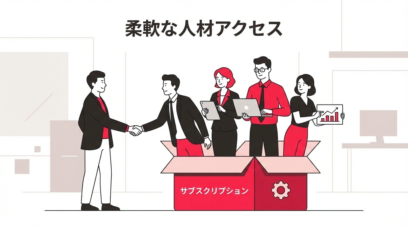 サブスク型の労働力活用とは、月額固定費用で必要な専門スキルを持つ人材やチームにアクセスできる仕組みのこと。NetflixやSpotifyのように、必要なサービスを定額で利用できるモデルを、人材活用に応用した考え方です。