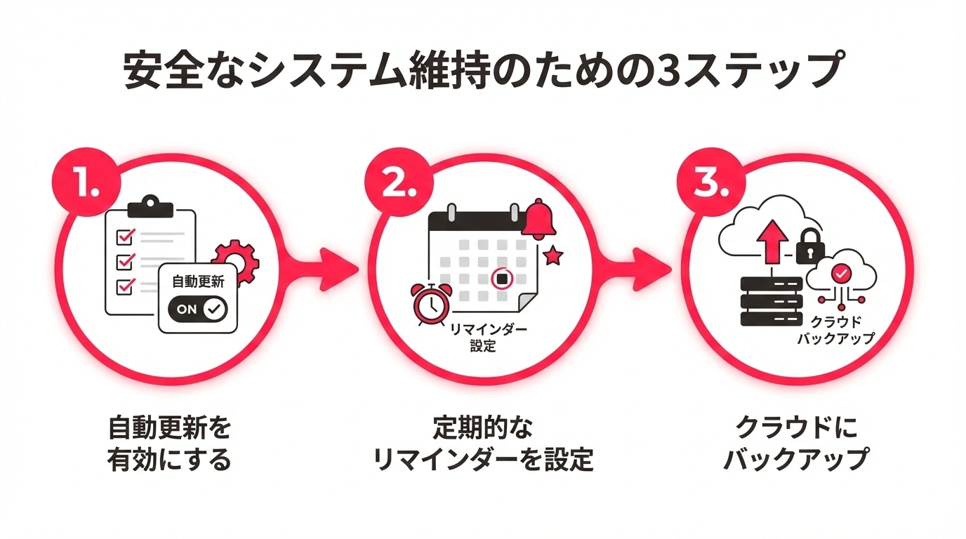 - 対策は簡単:自動更新の有効化、週1回の更新習慣、PC管理の仕組み化